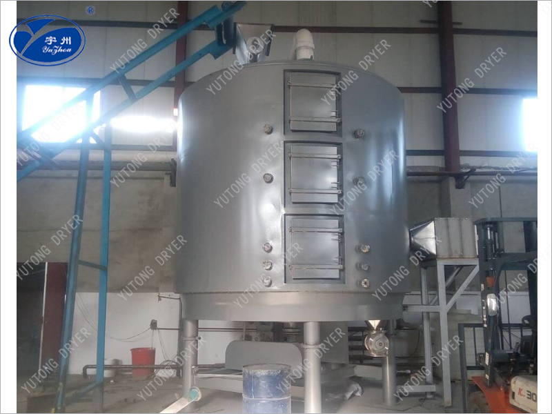 濕物料自加料器連續地加到干燥設備的D1層盤上,帶有耙葉的耙臂做回轉運動,使耙葉連續地翻轉物料,物料沿著指數螺旋線流過干燥盤表面,在低干燥盤上的物料移到外緣,并在外緣降落到下方的高干燥盤外緣,在高干燥盤上的物料向里移動并從中間落料落入下一層低干燥盤中,高低干燥盤上下交替排列,物料得以連續地流過整個干燥設備,中空的干燥盤內通入加熱介質,加熱介質從一端進入另一端導出,已干燥物料從Z后一層干燥盤降落到殼體底層,最后被耙葉移動到料口流出。蒸發出來的蒸汽經設置在頂部的排濕口流出,溶劑經冷凝器收回后經真空泵流出室外。底部流出的干物料冷卻后直接包裝。