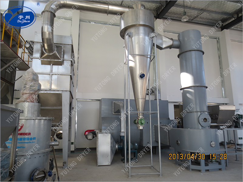 經過初、中效過濾的環境空氣由干燥系統鼓風機鼓入蒸汽散熱器加熱至工藝設定溫度,進入閃蒸干燥主機,與經過螺旋加料器送入干燥主機的待干燥濾餅,在干燥主機唄完成傳熱介質的干燥過程,氣固混合物由布袋除塵器分離、過濾后,物料被從干燥系統氣體內分離出來,排出干燥系統,尾氣由引風機排入大氣。