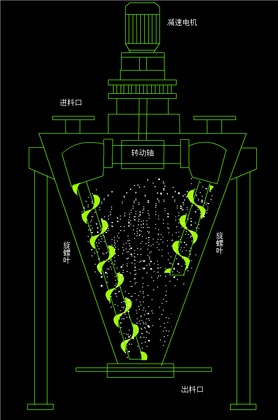 4. 上升的物料受自身重力作用下降 。四種運動在混合機內產生對流、剪切 、擴散、從而達到快速均勻混合的目的。