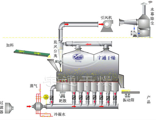 散粒狀固體物料由加料器加入流化床干燥機中, 潔凈的熱風經(jīng)閥板分配進入床體內(nèi),從加料器進入的濕物料被熱風形成沸騰狀態(tài)。由于熱風與物料廣泛接觸,增強了傳熱傳質的過程,因此在較短時間內(nèi)就可干燥。物料從床體的一頭進入,經(jīng)過幾十秒至幾分鐘沸騰干燥后由排料口排出, 廢氣由沸騰床頂部排出經(jīng)旋風除塵器組和布袋除塵器回收固體粉料后排空。