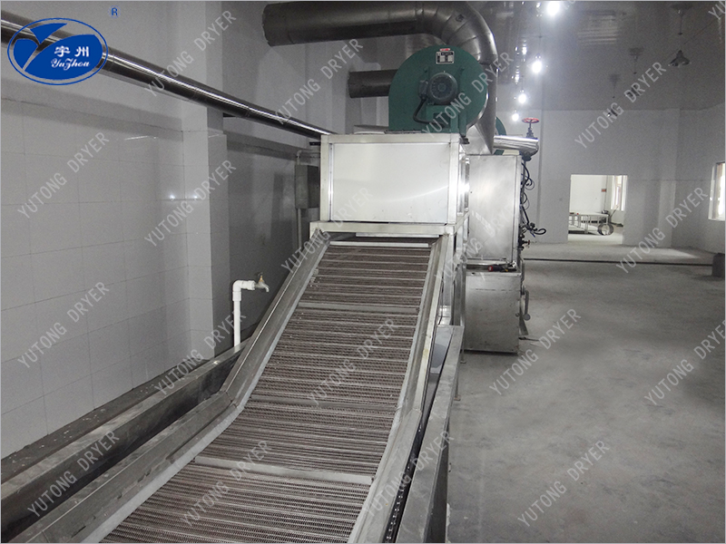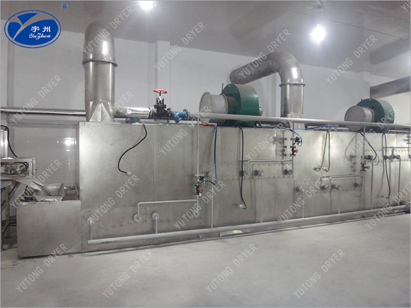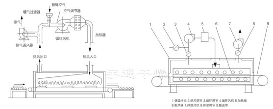 工作時熱風(fēng)以孔束流由上下同時噴向輸送帶上的物流,由于噴射氣速高達15m/s以上,故對流傳熱的膜極薄,傳熱系數(shù)大,干燥速度快,該設(shè)備用與不透氣類物料時,上面噴射氣流仍返回上面,下面噴出的氣流仍返回下面,在參與循環(huán)。對透氣性物料氣流束具有強穿透性及在物料內(nèi)部的擴散性。使用熱源可以是蒸汽,電,熱風(fēng)爐及燃油煙道氣等。