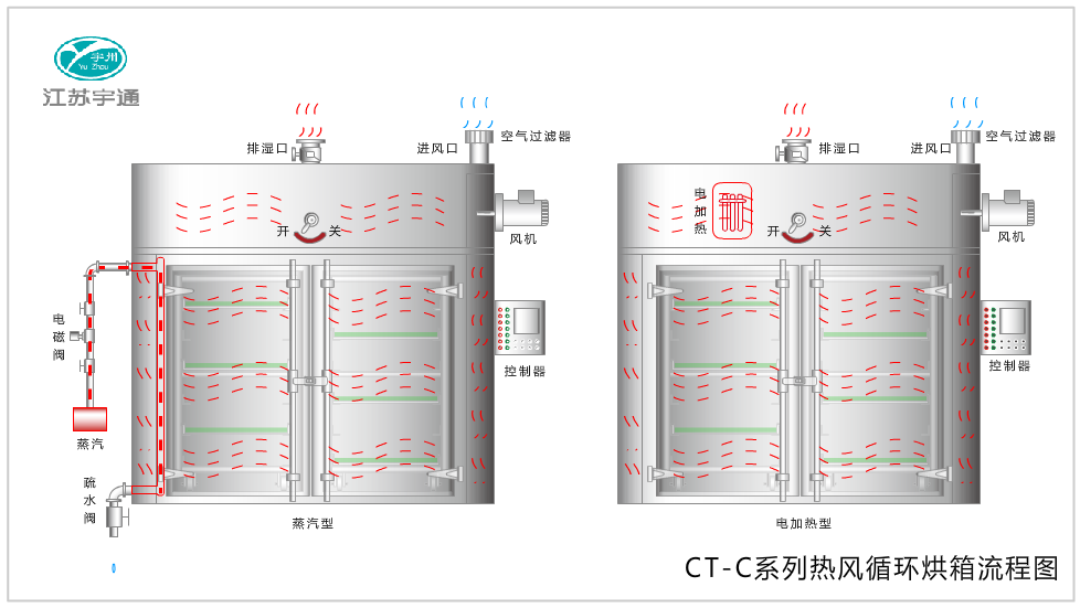 經過多次改造, 形成了CT-C系列烘箱, 該系列全部采用軸流風機,配用了自動恒溫控制系統, 并備用電腦控制系統供選擇。熱效率達70%左右,它是利用蒸汽或電為熱源, 用軸流風機對熱交換器對流換熱的方式加熱空氣,熱空氣層流經過烘盤與物料進行熱量傳遞。不斷的補充新鮮空氣與不斷排出濕熱空氣, 這樣來保證烘箱內適當的相對濕度。本系列烘箱的大特點是部分熱風在箱內進行循環,整個循環過程為封閉式,從而增強了傳熱,節約了能源。